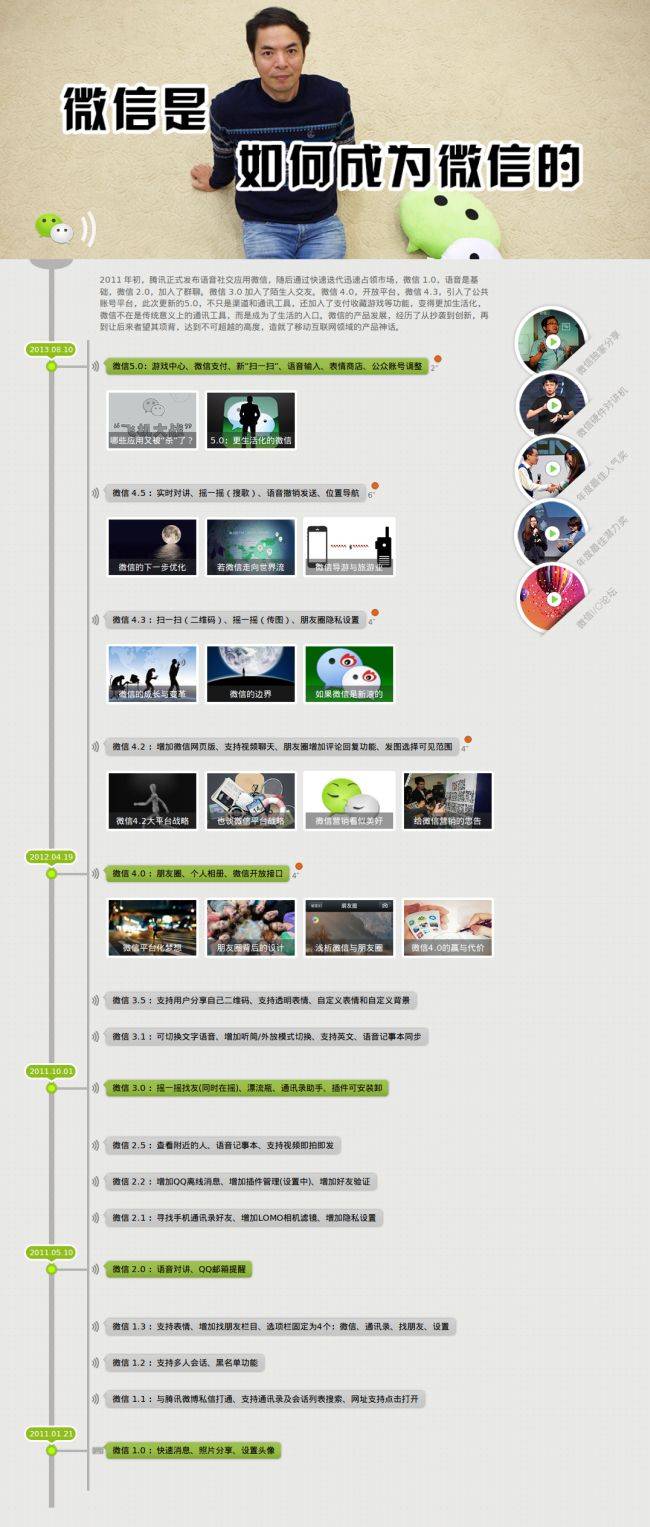 2011 年初,腾讯正式发布语音社交应用微信,随后通过快速迭代迅速占领市场,微信 1.0,语音是基础,微信 2.0,加入了群聊。微信 3.0 加入了陌生人交友。微信 4.0,开放平台,微信 4.3,引入了公共账号平台,此次更新的5.0,不只是渠道和通讯工具,还加入了支付收藏游戏等功能,变得更加生活化,微信不在是传统意义上的通讯工具,而是成为了生活的入口。