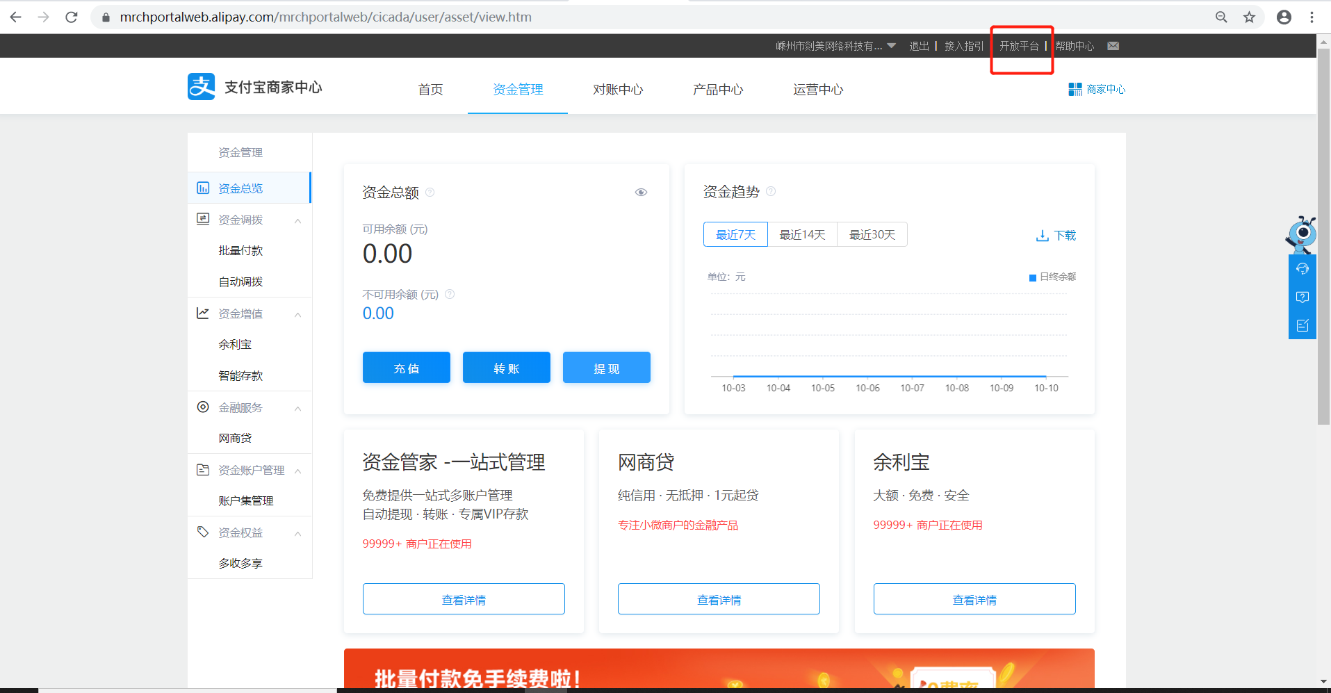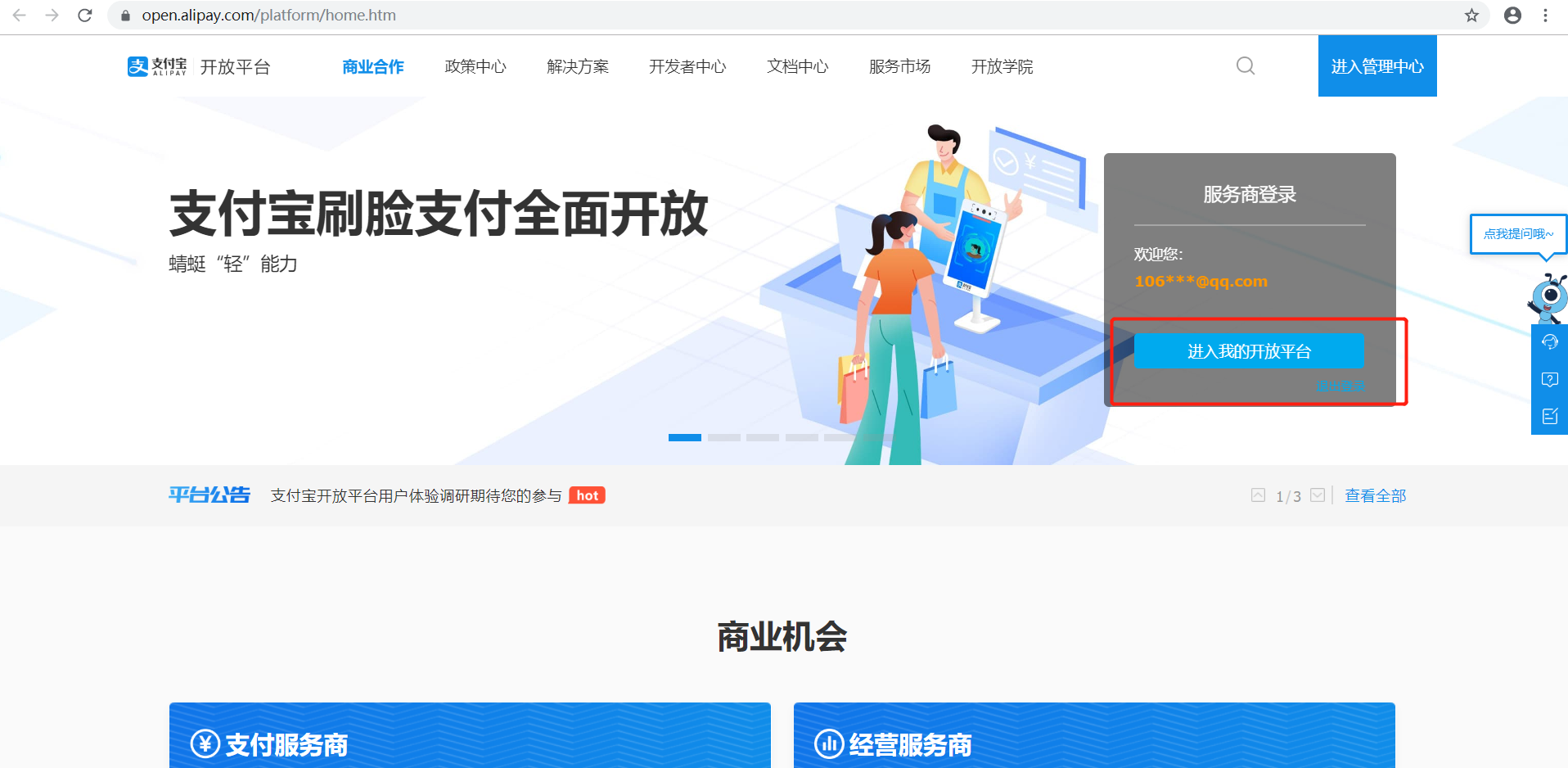 6、接下来需要开通开放平台商户,请访问蚂蚁金服开放平台.