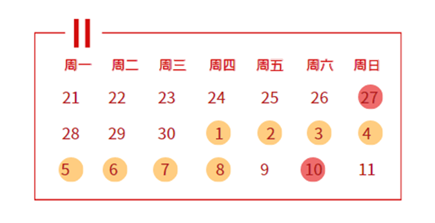10月1日(周四)至10月8日(周四)放假调休,共8天。